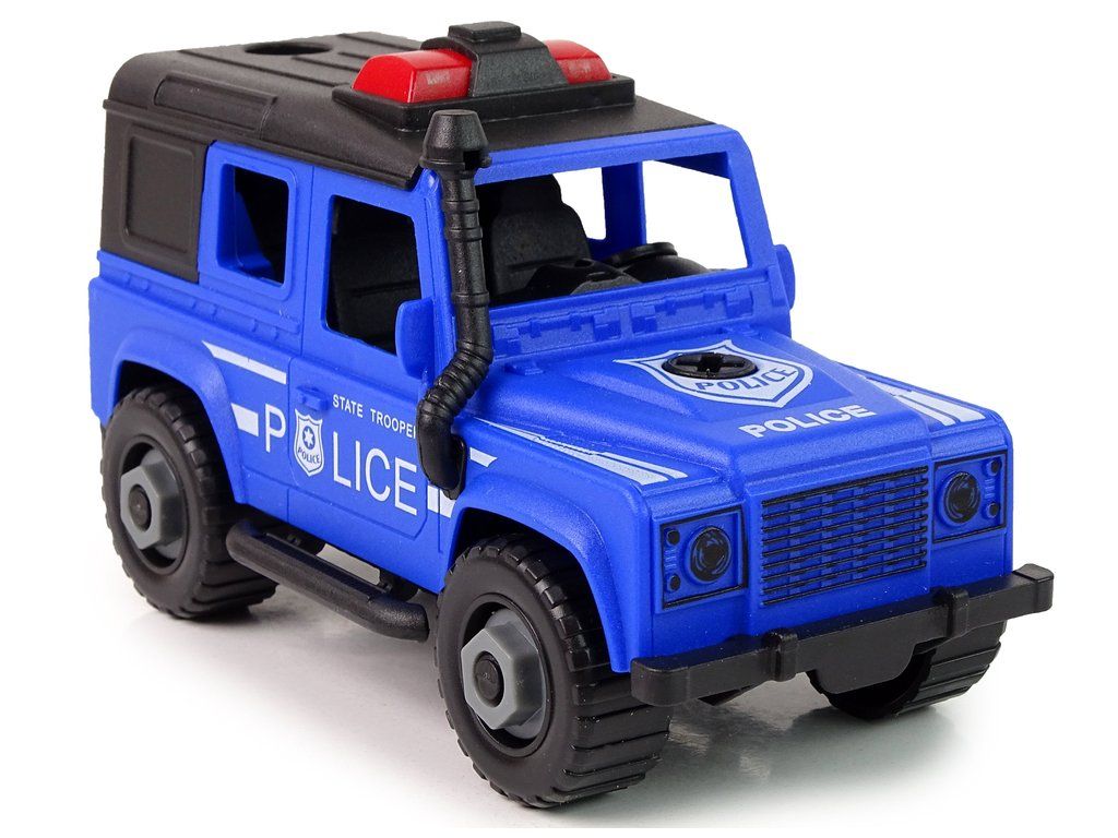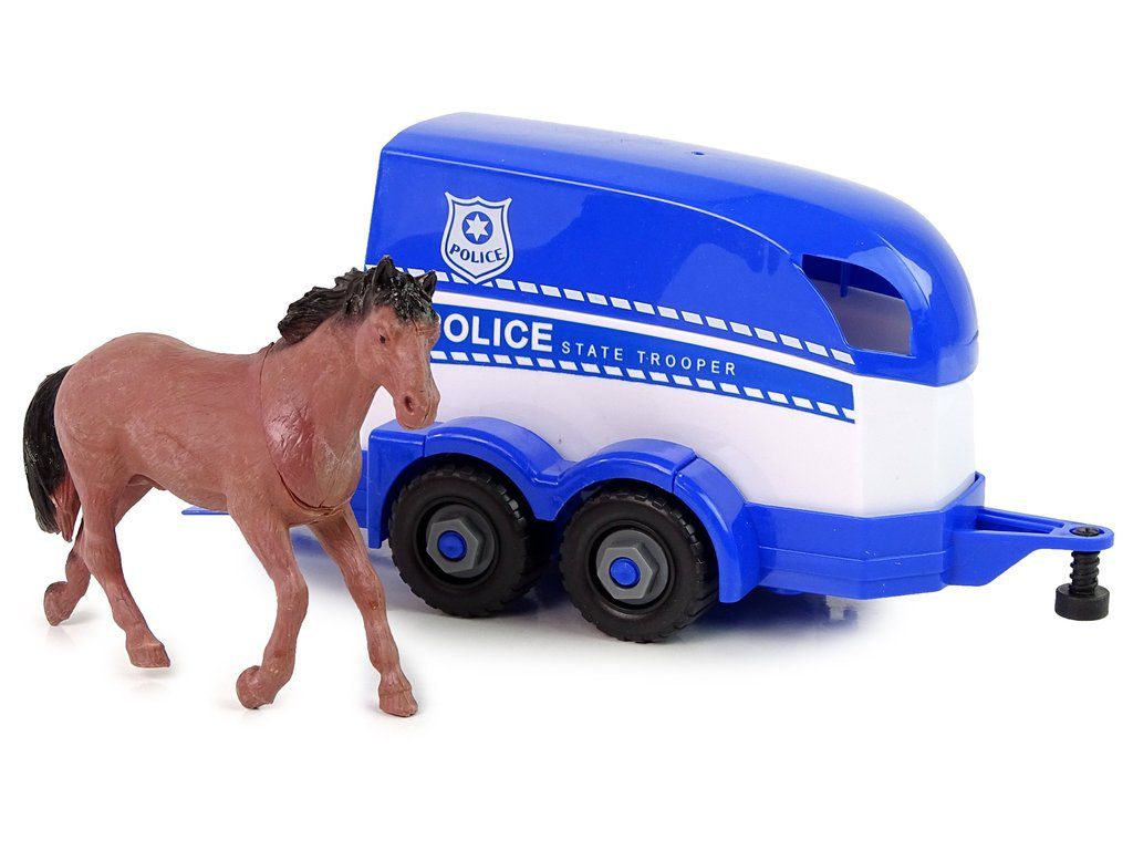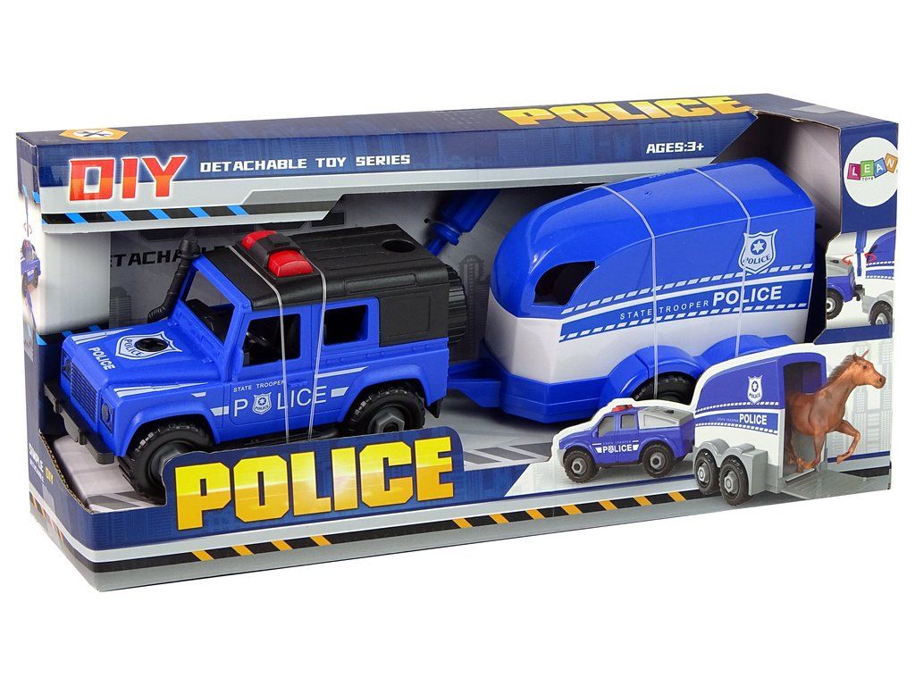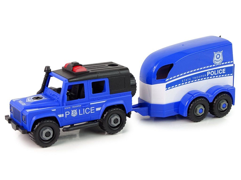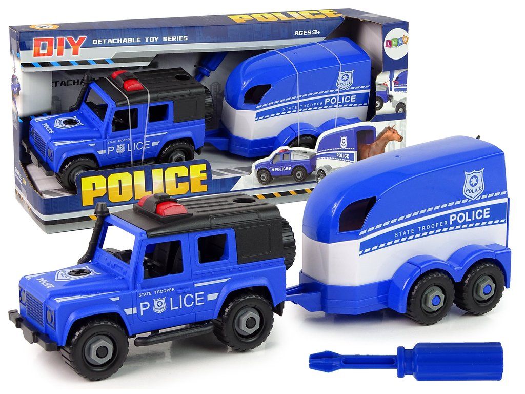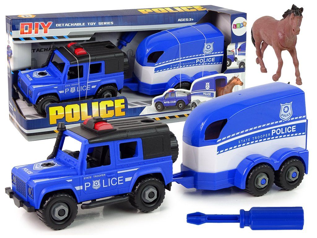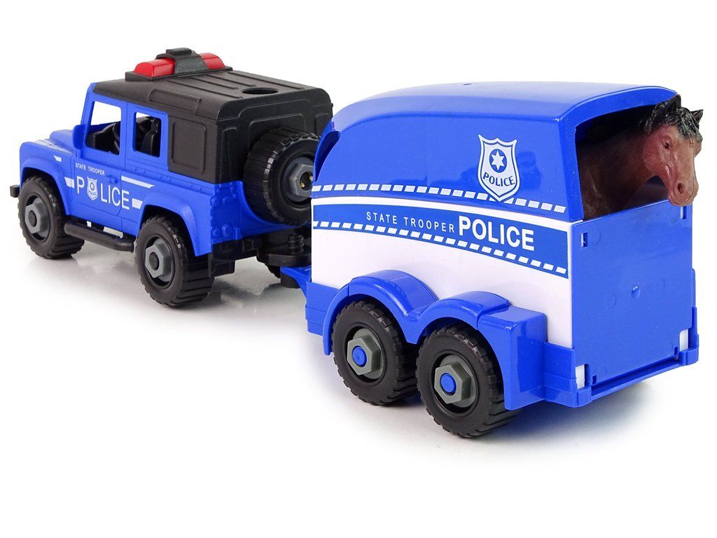 Terénní auto snadno převeze policejního koně. Vozidlo je vybaveno šrouby, které upevňují jednotlivé komponenty vozidla. Sada obsahuje šroubovák, kterým lze auto přišroubovat a sundat.