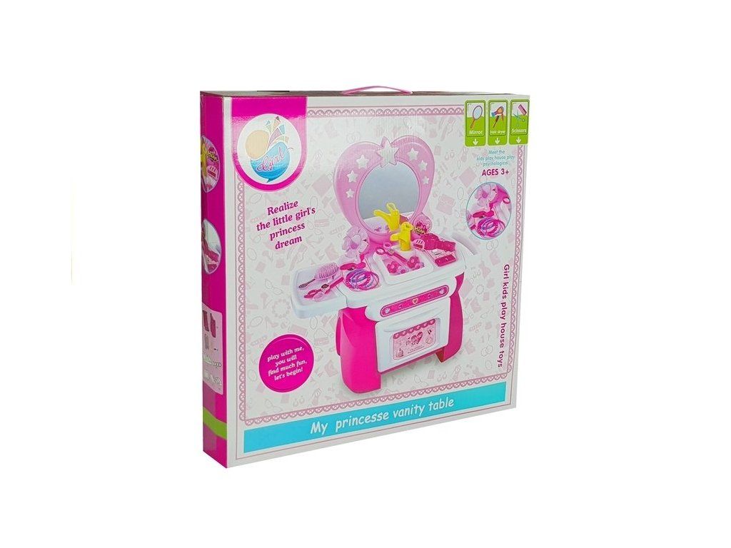 Každá malá princezna sní o svém místečku, kde se bude moci starat o svůj vzhled pro různé příležitosti. Toaletní stolek je růžový a je zdobený hvězdičkami a dívčími prvky.