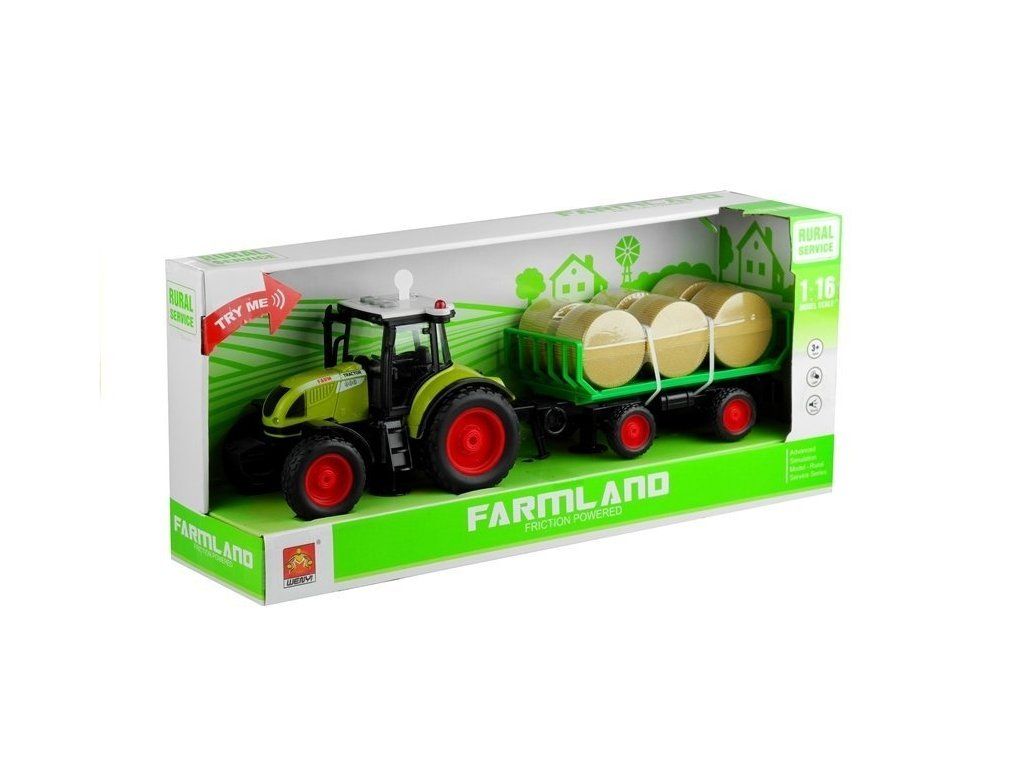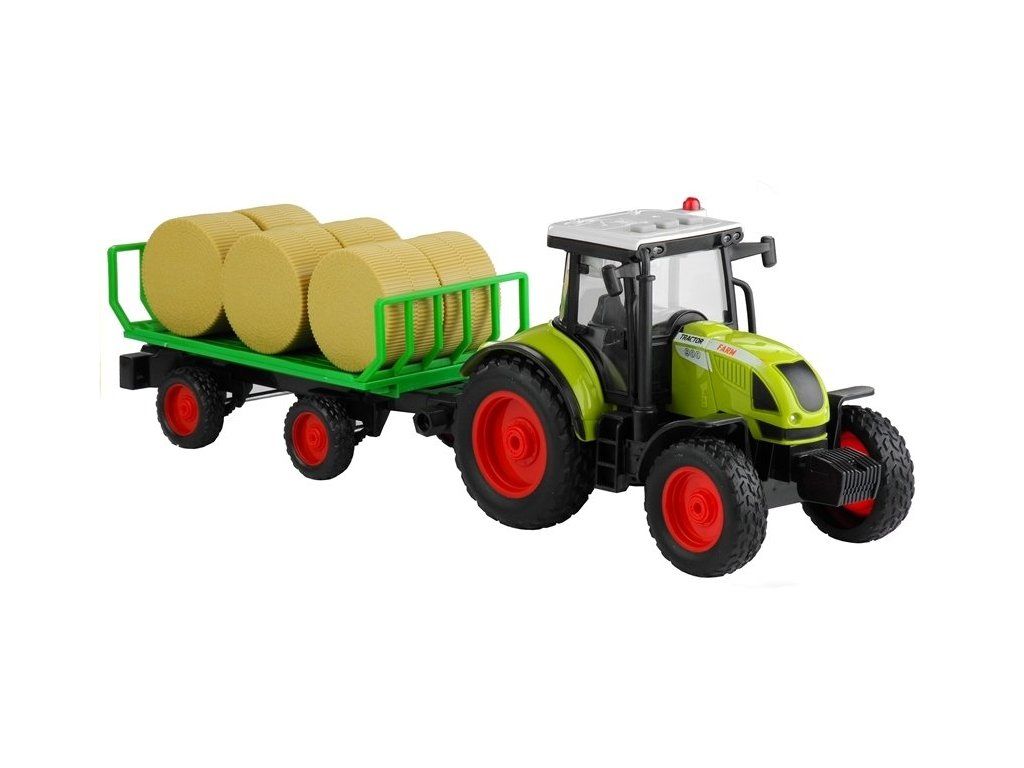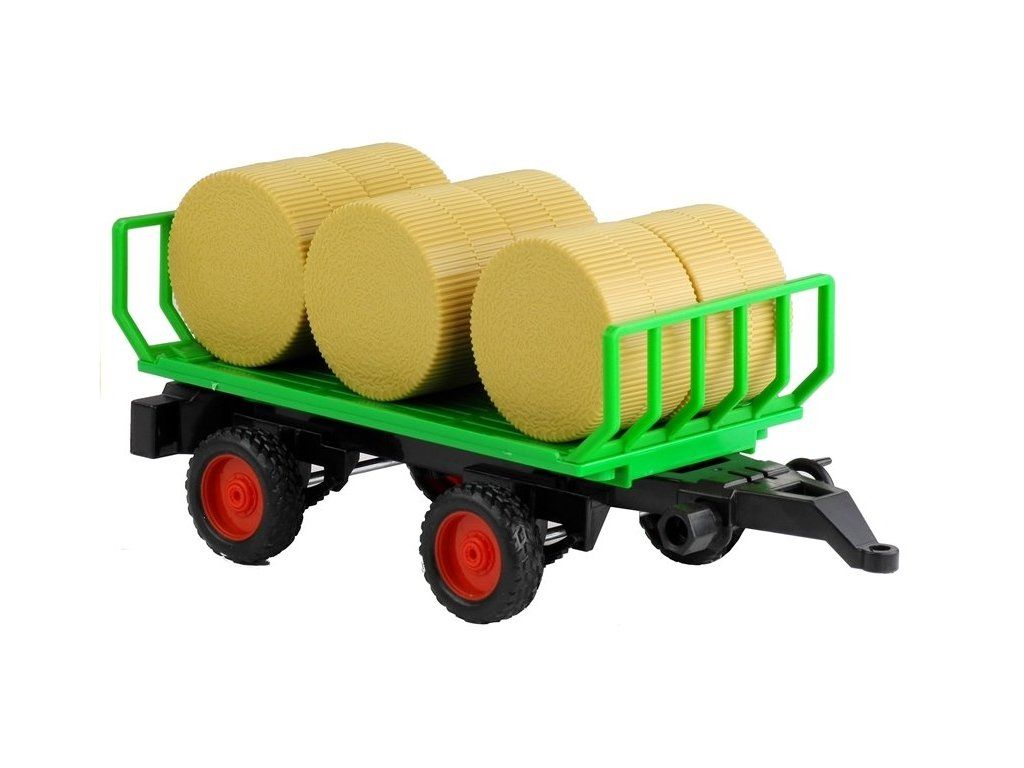 Zelený traktor s odnímatelnou vlečkou, který veze 6 balíků sena. Tyto prvky lze z přívěsu odebrat. Celá sada je vyrobena z vysoce kvalitního materiálu a jeho konstrukce je bez ostrých prvků a hran.