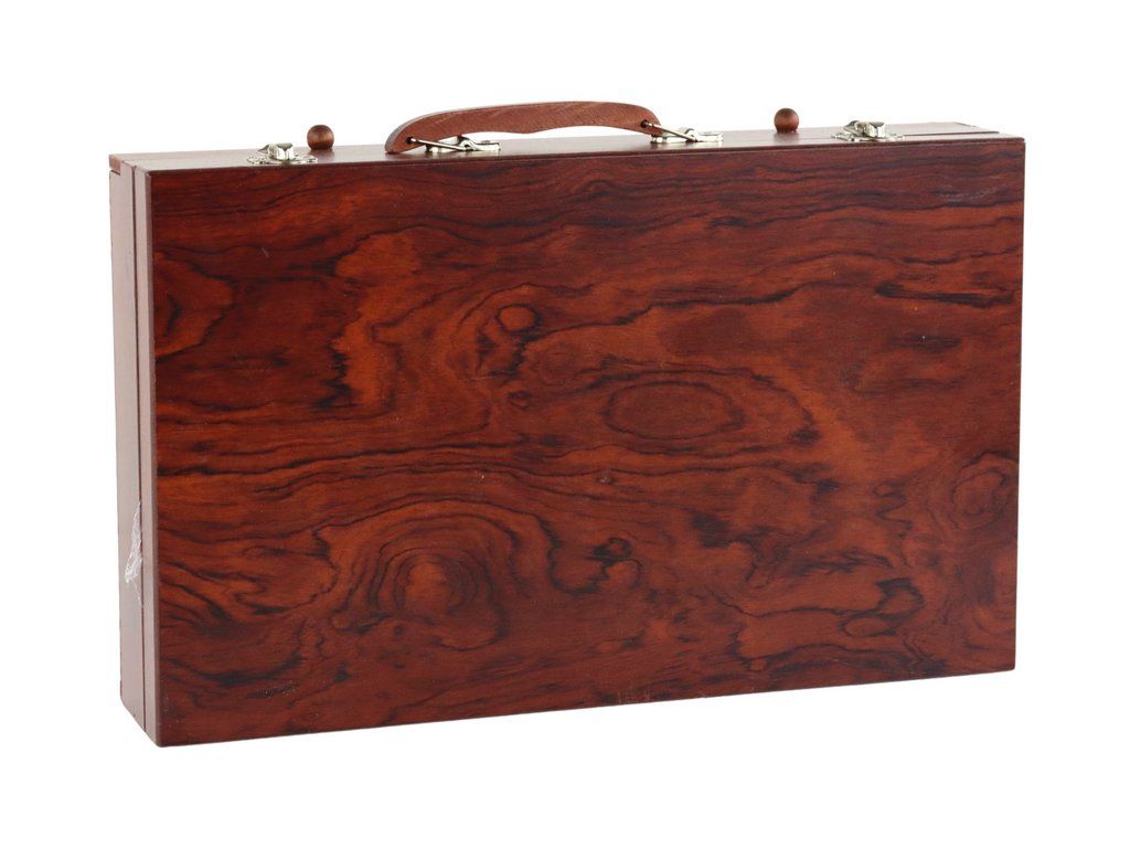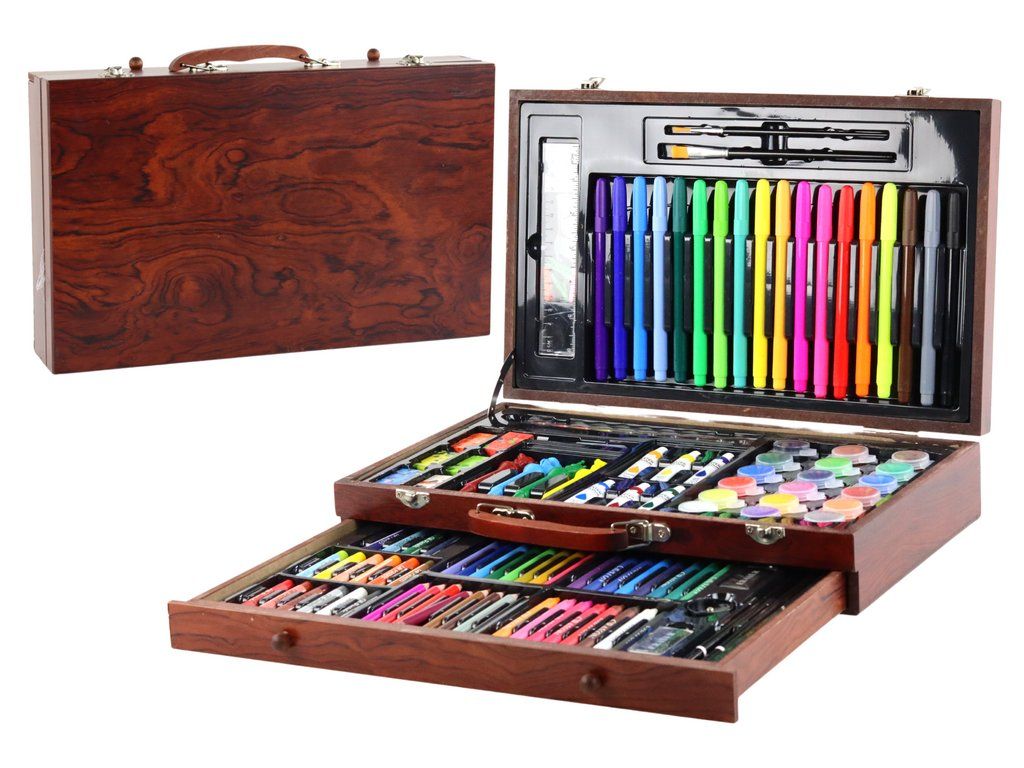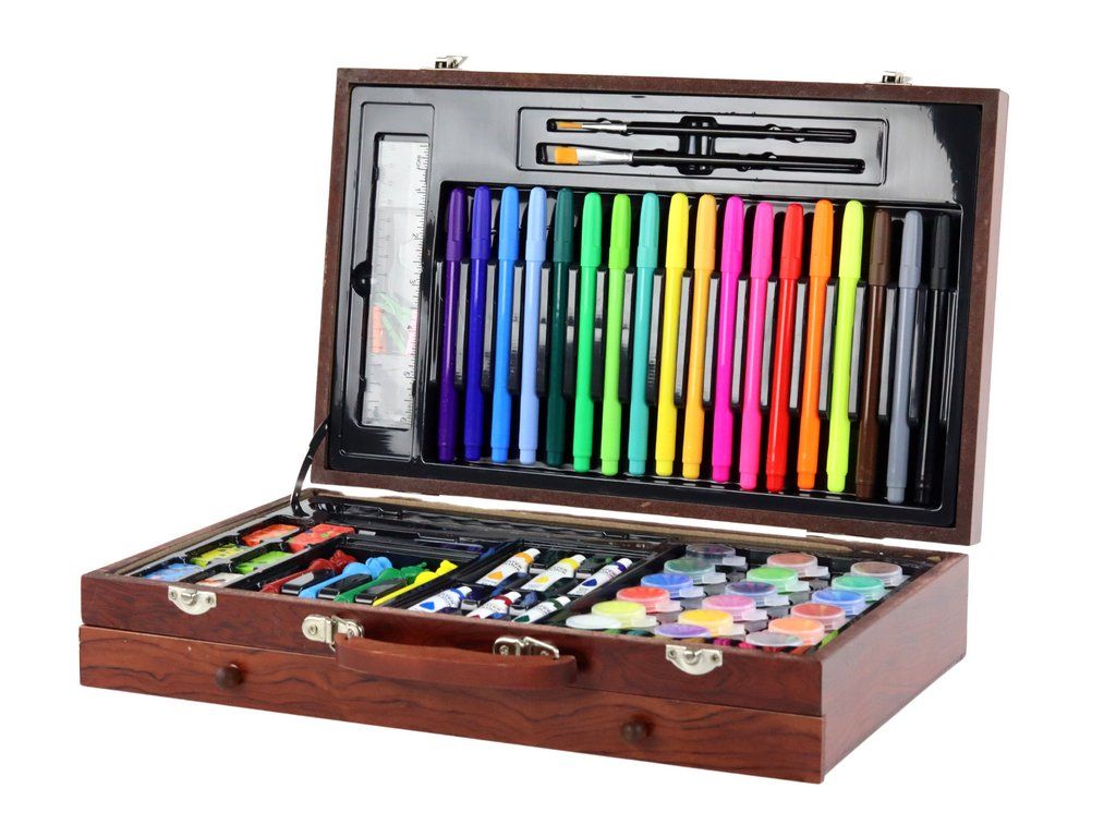 Po otevření kufříku se stanete svědky skutečné symfonie barev a tvarů. Pastelky, tři druhy barev, štětce, fixy, pravítko, kancelářské sponky a různobarevné tužky - to vše čeká na objevení. Pevná dřevěná konstrukce tuto jedinečnou sadu nejen chrání, ale také zvyšuje její estetickou hodnotu.