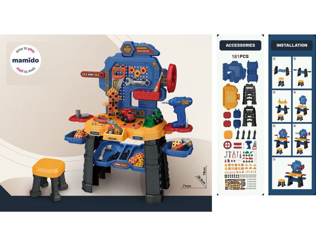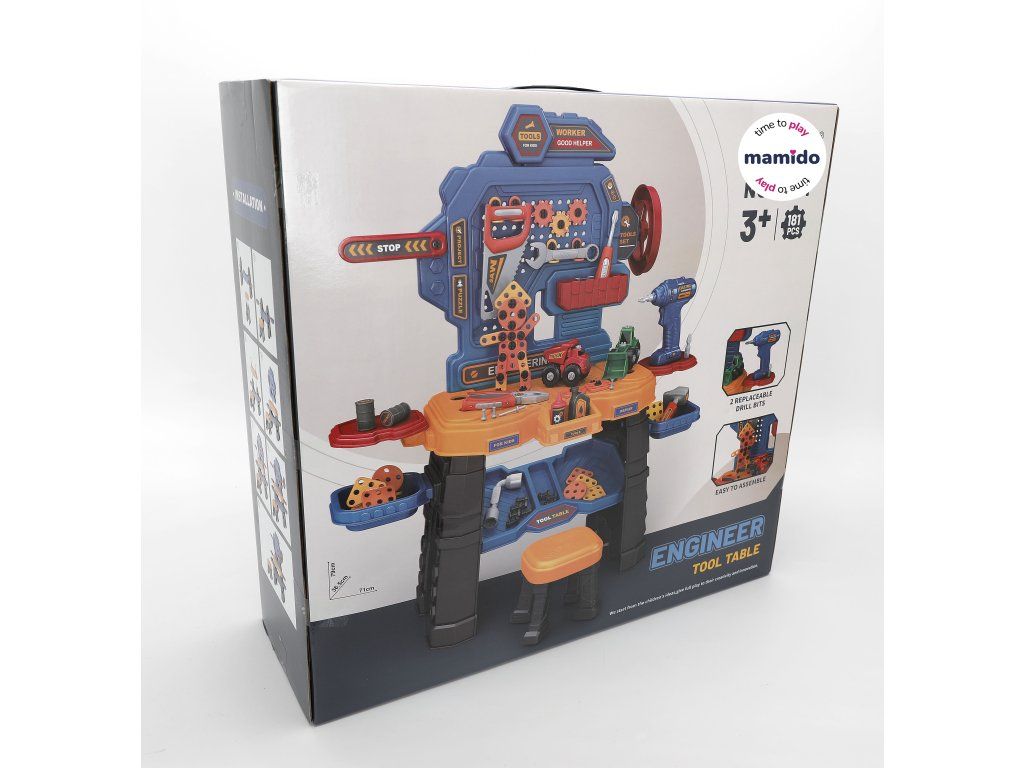 Pokud vaše dítě rádo pomáhá tatínkovi s kutilstvím, bude pro něj tato sada ideální. Sada je vyrobena z vysoce kvalitních materiálů a obsahuje 181 dílů. Vaše dítě si může sestavit kutilský stolek/dílnu a uspořádat na něm veškeré nářadí potřebné pro práci. Vrtačka je napájena 2 x 1,5V AA bateriemi (nejsou součástí balení) a lze ji použít k šroubování a vyšroubování šroubů.