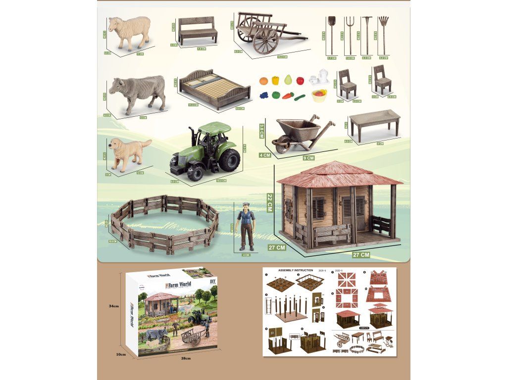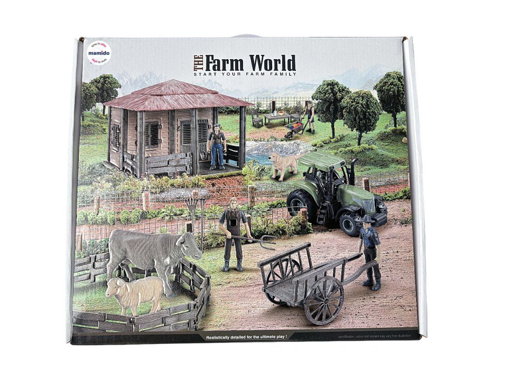 Součástí sady je farmářský domeček s otvíracími dveřmi, traktor se zemědělským náčiním, figurky farmářů, hospodářská zvířata (kráva, ovce, pes) a další doplňky – plot, kolečko, vůz, nábytek i ovoce a zelenina. Celá farma se dá sestavit podle návodu a poté libovolně upravovat.