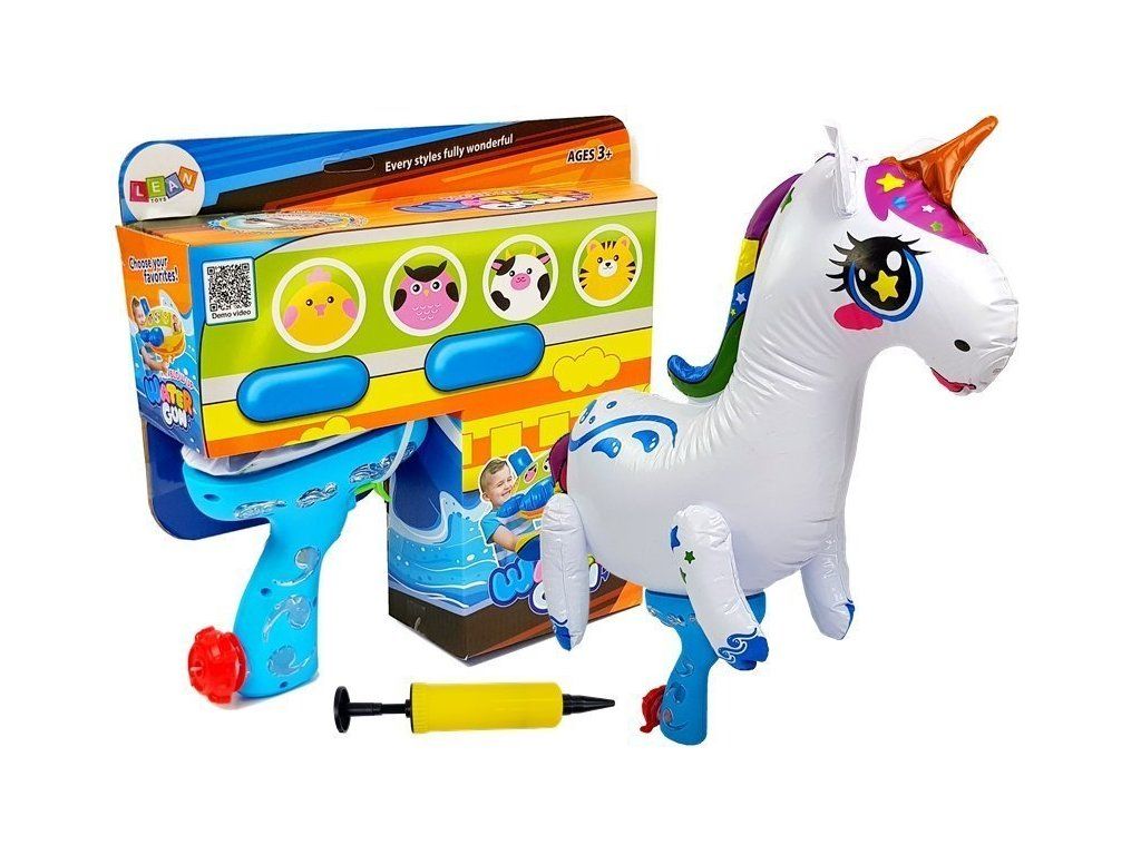 V sadě najdete také pumpu, kterou potřebujete k nafouknutí balónku jednorožce. Poté nalijte vodu do pistole a začněte hrát. Když stisknete spoušť, voda pumpuje nahoru a ven z jeho úst.