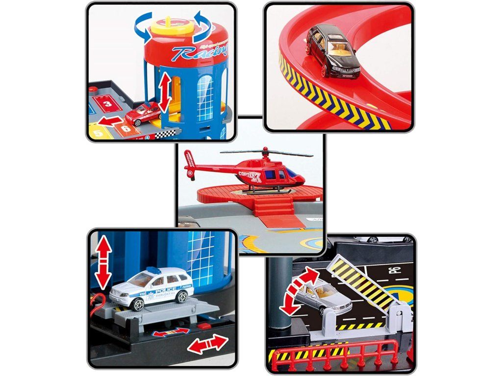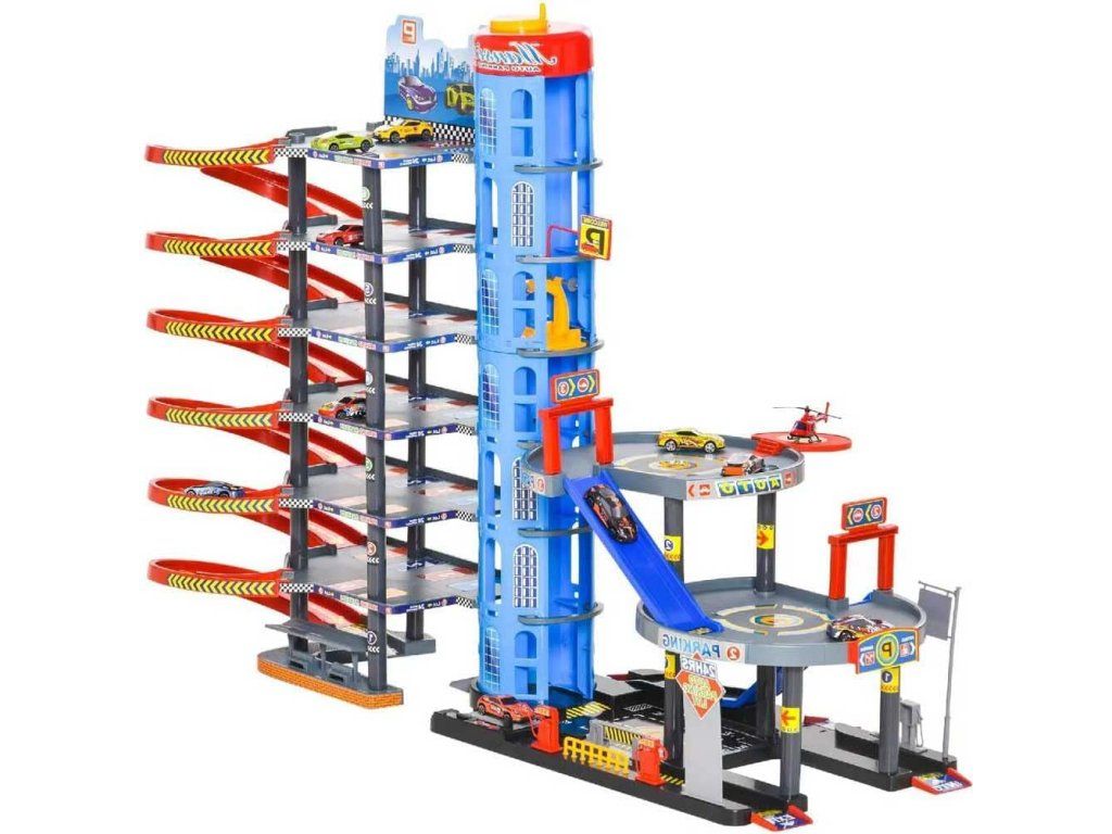 Velká a detailně propracovaná vícepatrová garáž s výtahem, spirálovými sjezdy a bohatou výbavou pro hraní s autíčky. Děti mohou auta vytahovat pomocí mechanického výtahu až do horních pater a poté je pouštět dolů po dlouhých spirálových drahách. Součástí jsou také autíčka, doplňky a interaktivní prvky, které zajišťují dlouhotrvající zábavu.