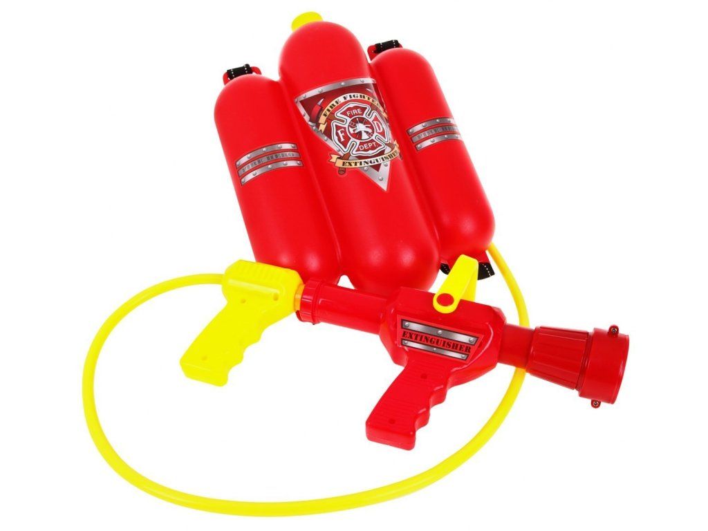 Nalijte vodu do nádrže, položte ji na záda, připojte hadici na vodu, nasaďte speciální přilbu, vestu a jste připraveni hasit požáry. Vodní postřikovač má regulaci tlaku vody. Estetické zpracování a živé barvy jsou dalšími výhodami této sady.