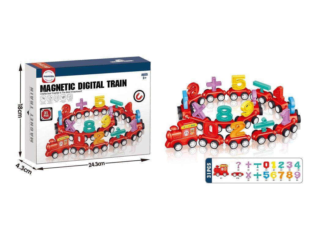 Magnetický vláček s čísly a matematickými znaky pomůže dětem hravou formou procvičit číslice a základní početní úkony. Každý vagónek se snadno spojuje pomocí magnetů a nese barevné číslo nebo matematický symbol.