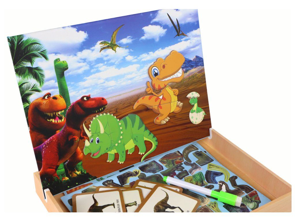 Na víku krabičky je vyobrazeno pravěké místo, kde si děti mohou vytvářet vlastní příběhy. Druhá strana desky navíc slouží jako kreslicí plocha s přiloženým fixem, což dětem umožňuje vyjádřit se v umění.