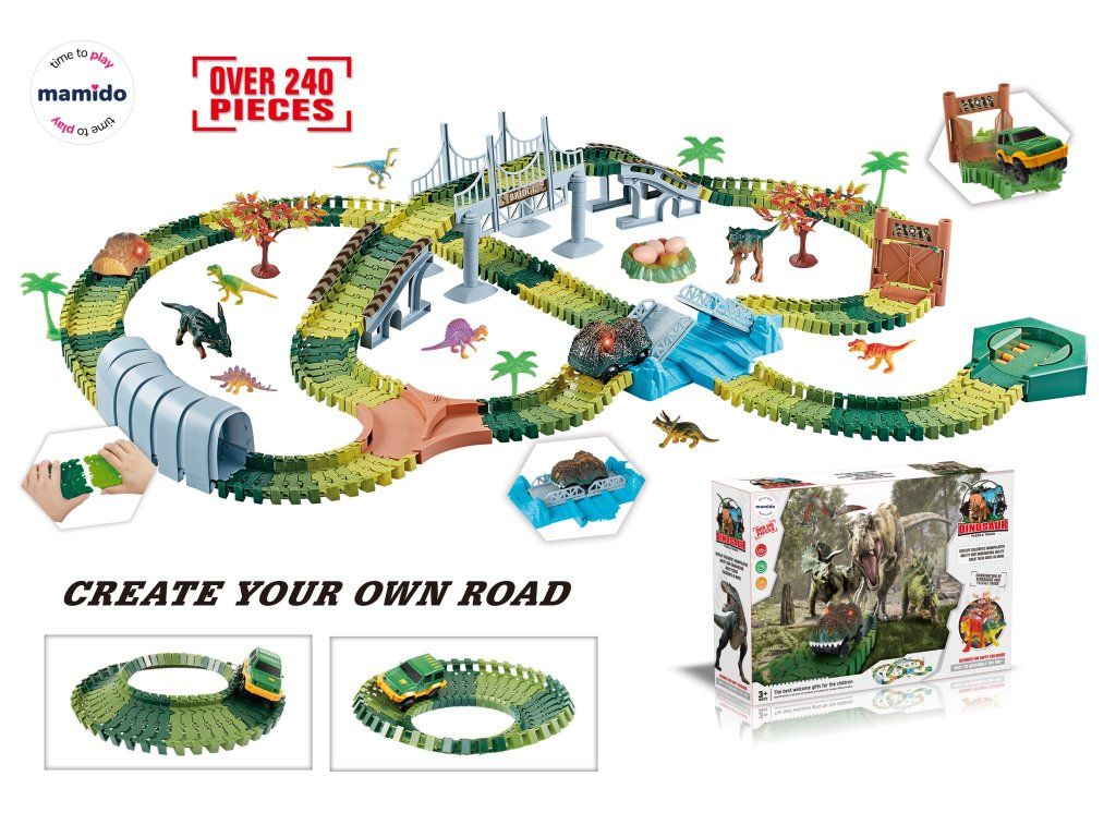 Součástí setu jsou stromy, dinosauři, most a další doplňky, které dělají hru ještě realističtější. Díky jednoduchému systému skládání si děti mohou snadno dráhu přestavovat podle své fantazie.