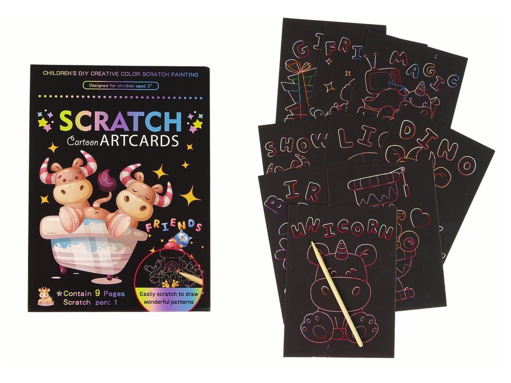 V sadě najdete 9 obrázků k seškrabání. Zábava je jednoduchá: pomocí speciální dřevěné špejle můžete z obrázku seškrabat černou vrstvu a odhalit krásné a barevné ilustrace.