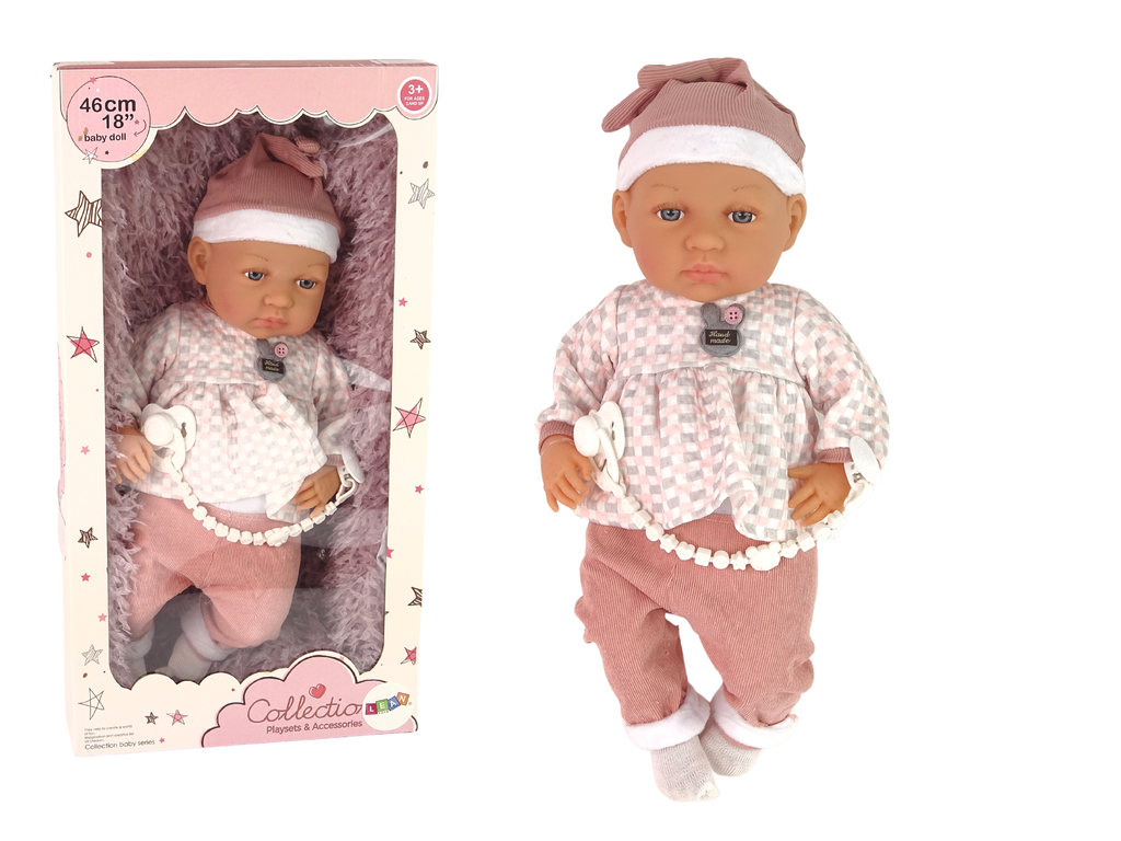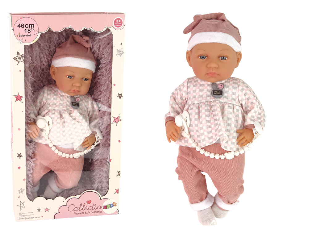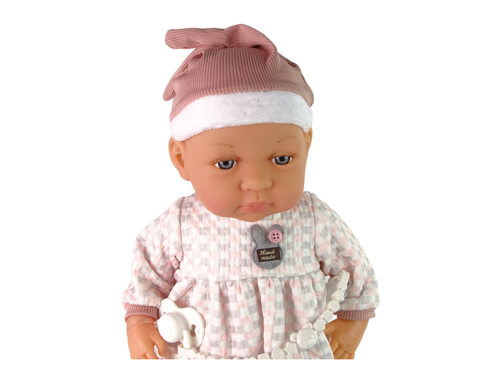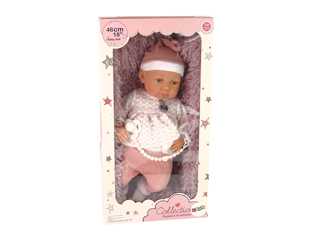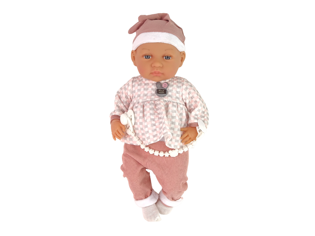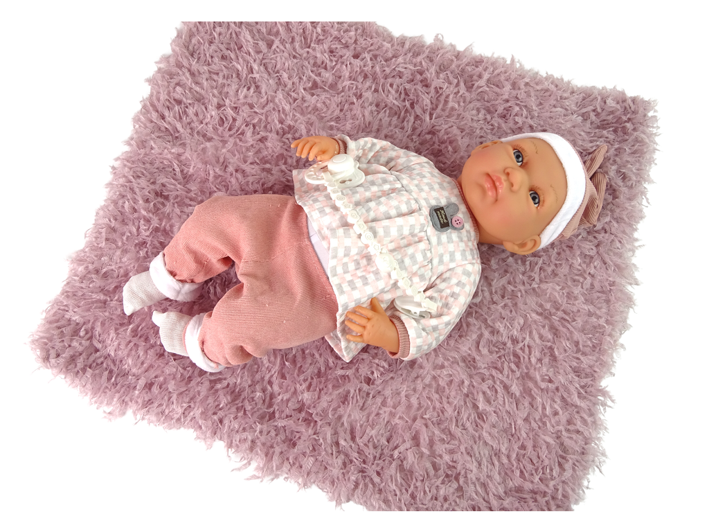 Panenka velikostí i zpracováním připomíná skutečné miminko. Dítě je oblečeno v růžových kalhotách, kostkovaném svetru, světlých ponožkách a čepici. Panenka má také krásnou deku s peřím v růžovém odstínu, příjemná na dotek.